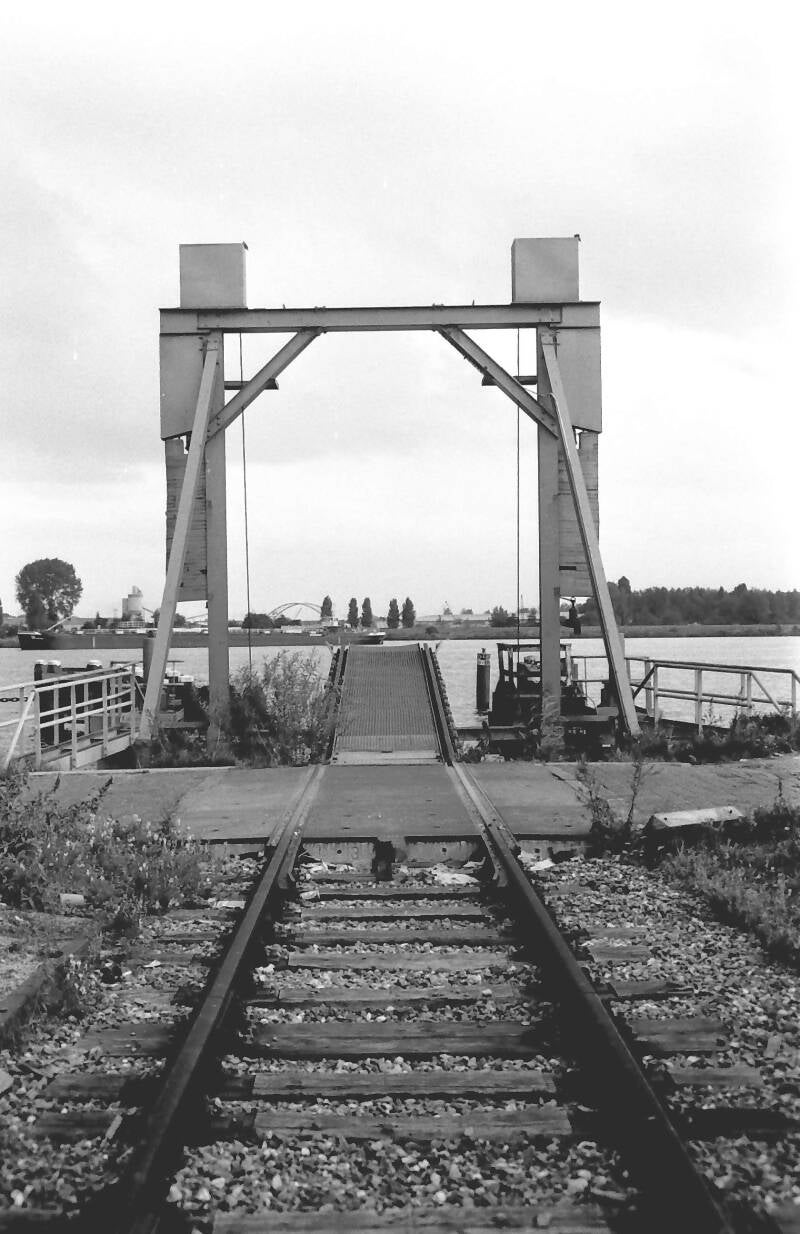Oprijbrug voor spoorpont. Amsterdam, rangeerterrein De Rietlanden, Ertskade, 8-9-1986